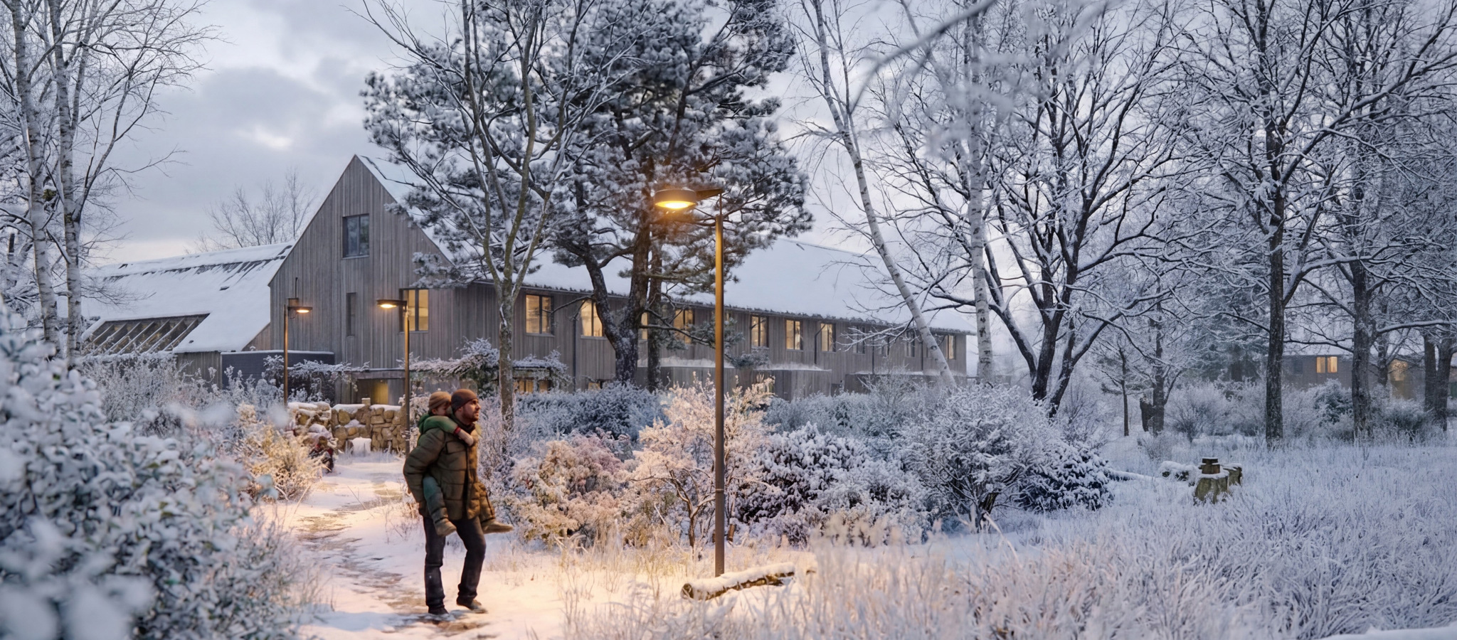 Hoewel de sneeuw in Nederland nog in geen velden of wegen te bekennen is, is de winter inmiddels wél aangebroken. De natuur in Kloostergoed Theresia is in ieder seizoen een plaatje, maar stel je voor dat je straks op deze locatie woont met sneeuw. Deze impressies geven je alvast een doorkijkje naar hoe het hier in de toekomst uit kan zien. Kun jij het al inbeelden?